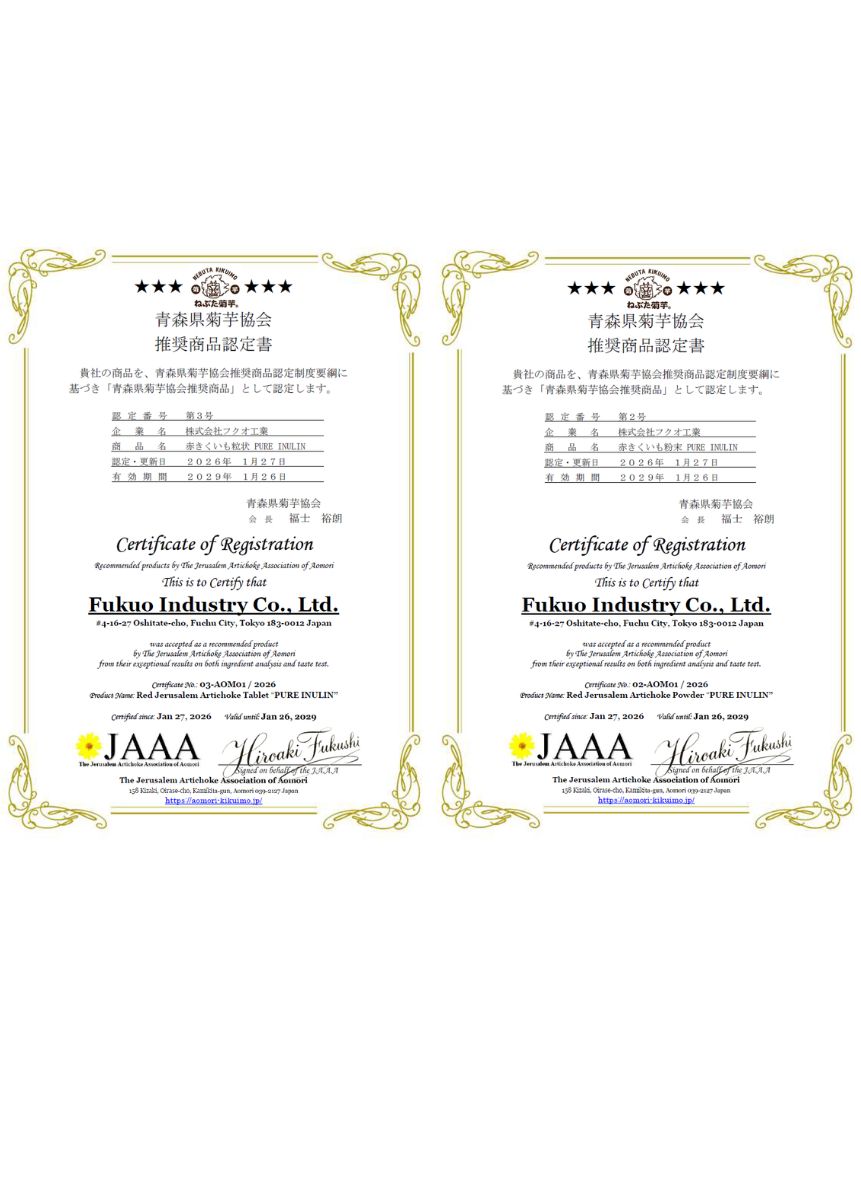 このたび、「青森県菊芋協会」より推奨商品として認定いただきました。